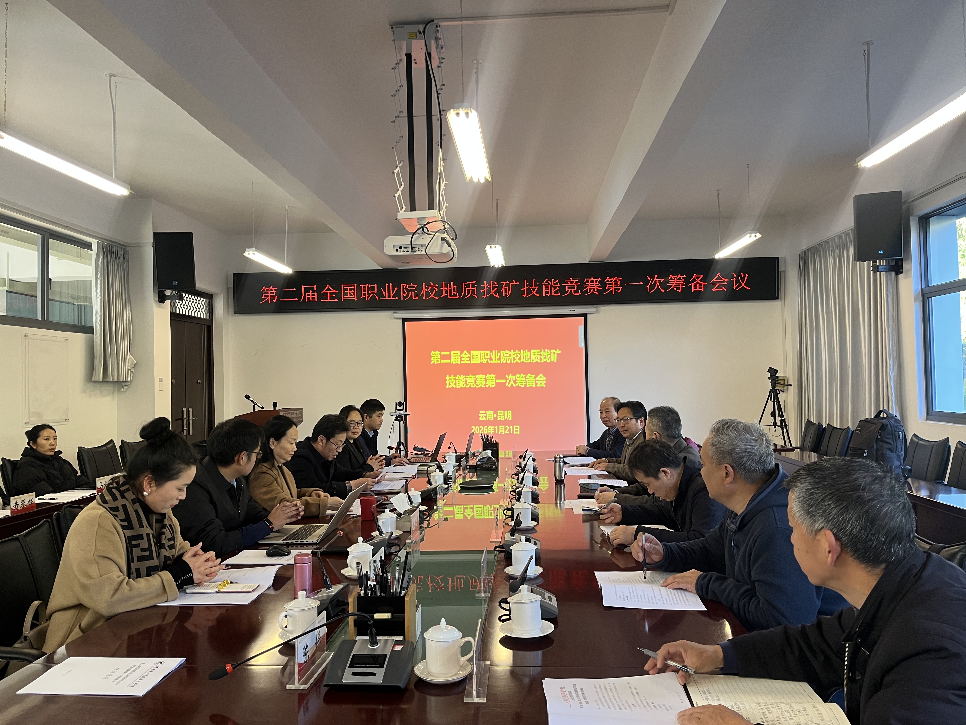 1月21日,第二届全国职业院校地质找矿技能竞赛第一次筹备会议在我校明尚楼C410会议室顺利召开。会议采用线上线下融合模式,自然资源部人力资源开发中心副主任吴卫东,我校党委副书记、校长陈颖及相关部门负责人,以及来自全国多所院校的专家、参赛院校代表出席会议。会议由我校党委委员、副校长齐武福主持。